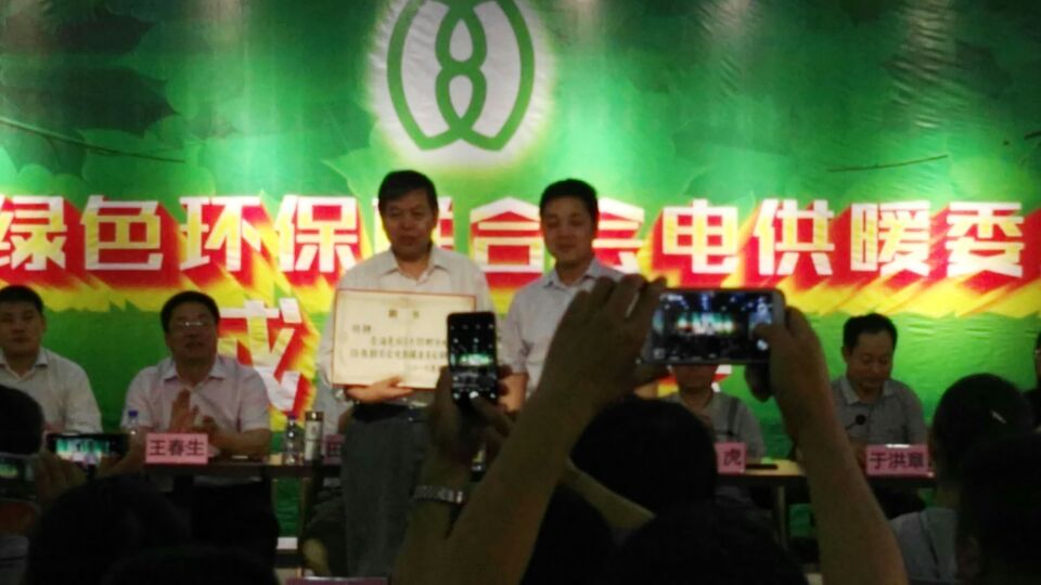邯郸市绿色环保联合会会长田尚宏向邯郸市绿色环保联合会电供暖委员会会长马建岗颁牌。